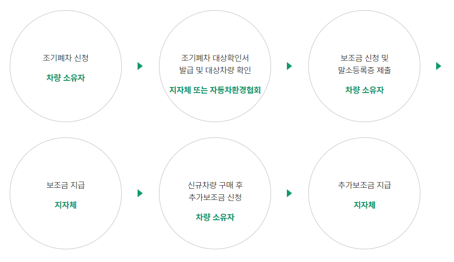 자동차소유자가 구비서류를 첨부하여 지자체나 자동차협회에 노후차량 조기폐차 보조금 지급대상 확인신청서를 제출합니다.
