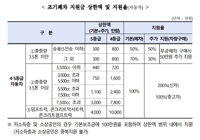 노후 경유차 조기폐차 지원금은 4등급 차량은 최대 800만 원, 5등급 차량은 최대 300만 원까지 지급받을 수 있습니다. 여기에 추가로 폐차 후 무공해차로 새로 차량 구매 시 50만 원을 추가 지원합니다.