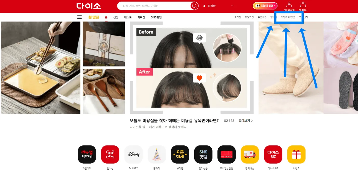 PC버전에서 다이소 재고조회를 하시려면 다이소몰 사이트를 이용하면 됩니다. 다이소몰에는 매장픽업과 택배배송이 가능한 다양한 균일가의 생활용품들을 만나볼 수 있는데요. 사이트 오른쪽 상단에 있는 매장위치/상품을 선택합니다.