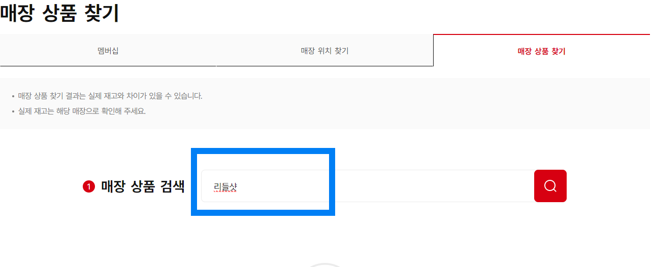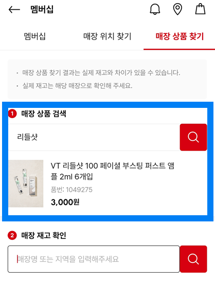 여기서 PC버전에서 검색한 것과 동일하게 검색해 주면 됩니다. 이번에도 다이소 품절대란 상품인 리들샷을 검색해 보겠습니다. 저는 VT 리들샷 100 페이셜 부스팅 퍼스트 앰플을 선택했습니다. 그러면 상품검색은 끝나고 두 번째 방문할 매장을 선택하면 됩니다.