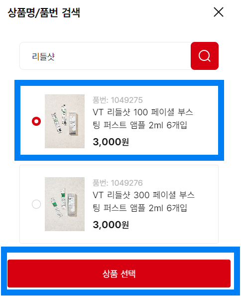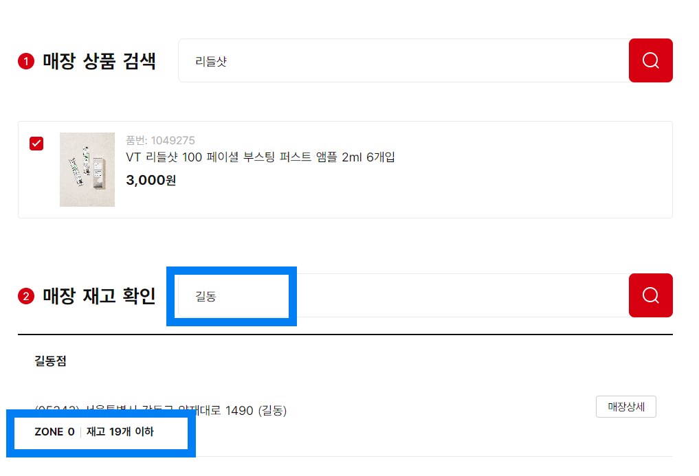 저는 요즘 다이소 오픈런이 생길 정도로 품절대란을 일으키고 있는 VT 리들샷의 재고조회를 해보겠습니다. 매장상품검색에서 리들샷을 검색해봅니다. 100과 300 두 가지 종류가 나오는데요. 매일 바를 수 있는 100으로 조회를 해보겠습니다.