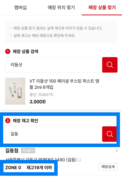 길동으로 검색해 보니 존 0에 재고가 19개 이하로 남아있다고 나옵니다. 이렇게 상품위치와 재고를 확인한 후에 방문하여 상품을 구매할 수 있습니다.