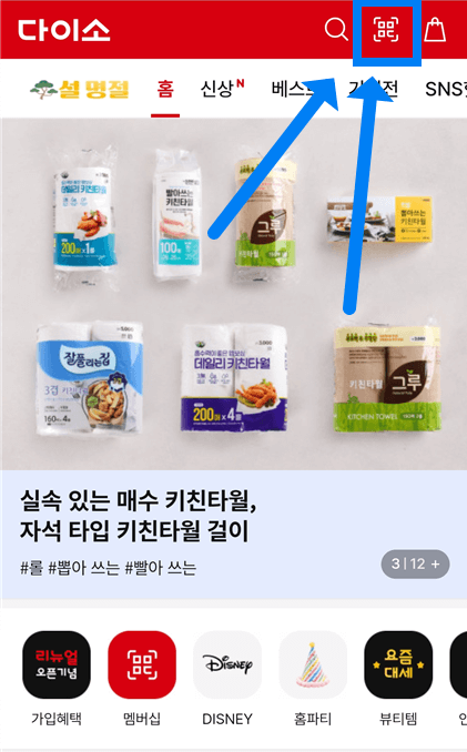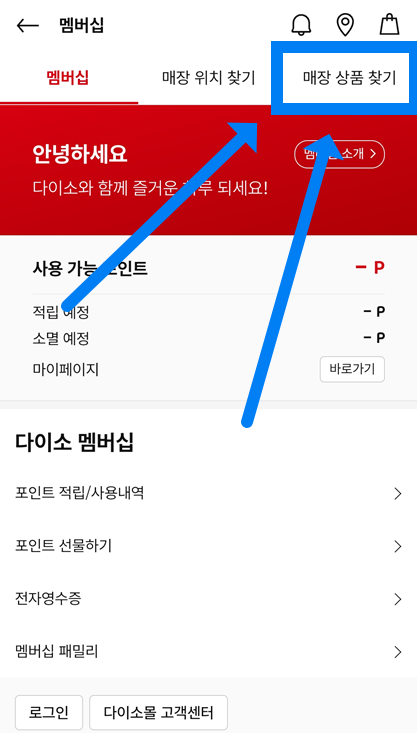 다이소 어플을 다운로드한 다음 메인 화면 오른쪽 상단에 있는 바코드모양 버튼을 선택합니다. 그럼 멤버십 화면으로 이동하는데 다시 한번 오른쪽 상단 매장 상품 찾기로 이동합니다.