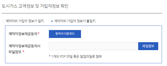 ⑥ 도시가스 고객정보 및 가입자정보를 확인합니다. 이때 계약자와 가입자가 불일치하다면 위에서 안내드린 계약자정보제공동의서를 첨부하면 됩니다.