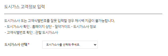 ⑤ 도시가스 고객정보(도시가스사, 고객식별번호) 입력합니다. 각 도시가스사 별로 고객식별번호를 확인하는 방법이 다른데 아래 "도시가스사별 고객식별번호 확인 방법" 파일 참고하여 확인 가능합니다.