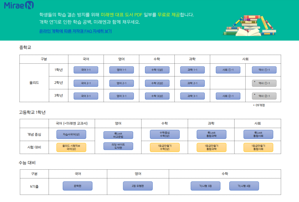 미래엔은 학생들의 학습 결손을 방지하기 위하여 미래엔 대표 도서인 참고서 PDF 일부 또한 무료로 제공하고 있습니다. 중고등학교 참고서와 시험대비, 수능대비 문제집 또한 제공하고 있어 도서 구매 비용을 절감할 수 있는 매우 좋은 혜택입니다.