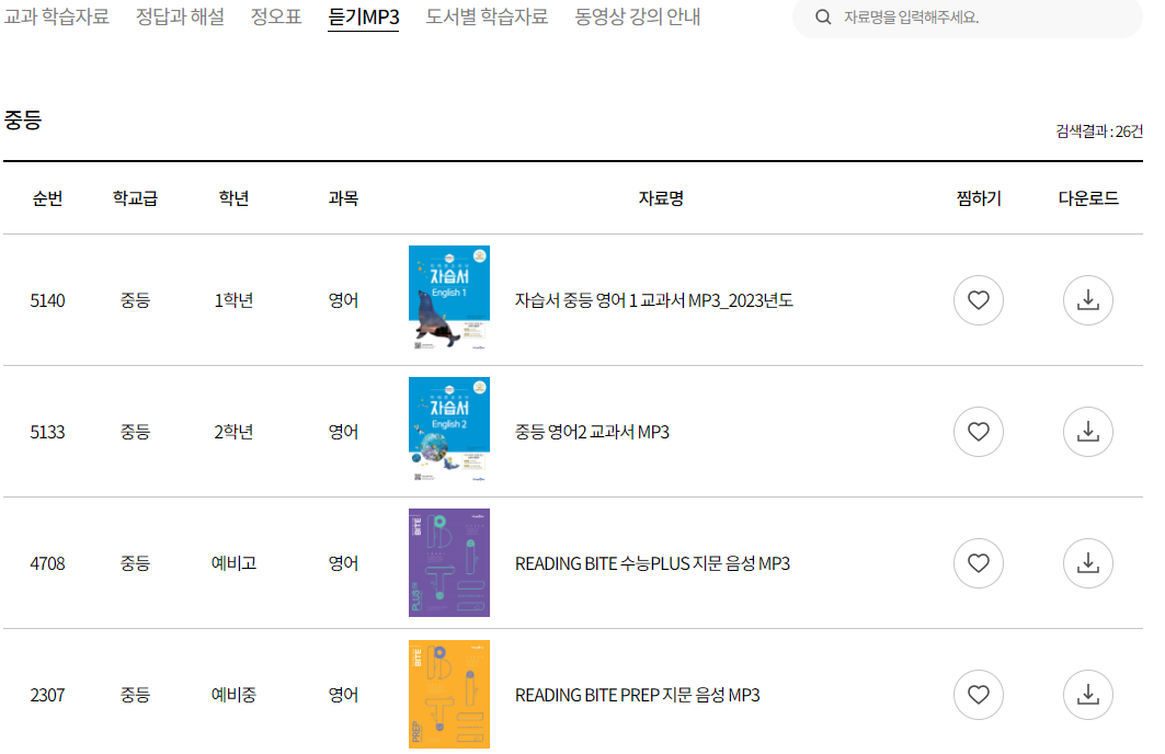 아래 버튼으로 초중고 듣기 MP3 다운로드도 함께 해보시기 바랍니다. 해당 페이지에서 교과 학습자료와 정답과 해설지, 정오표까지 한번에 확인이 가능하니 한번 둘러보시기 바랍니다.