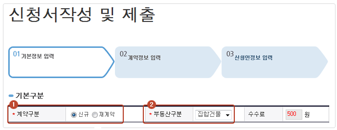 확정일자 받는법 1단계로 기본정보 입력창에서 계약 구분과 부동산 구분을 선택합니다. 계약은 신규계약과 재계약 중 선택하면 됩니다.